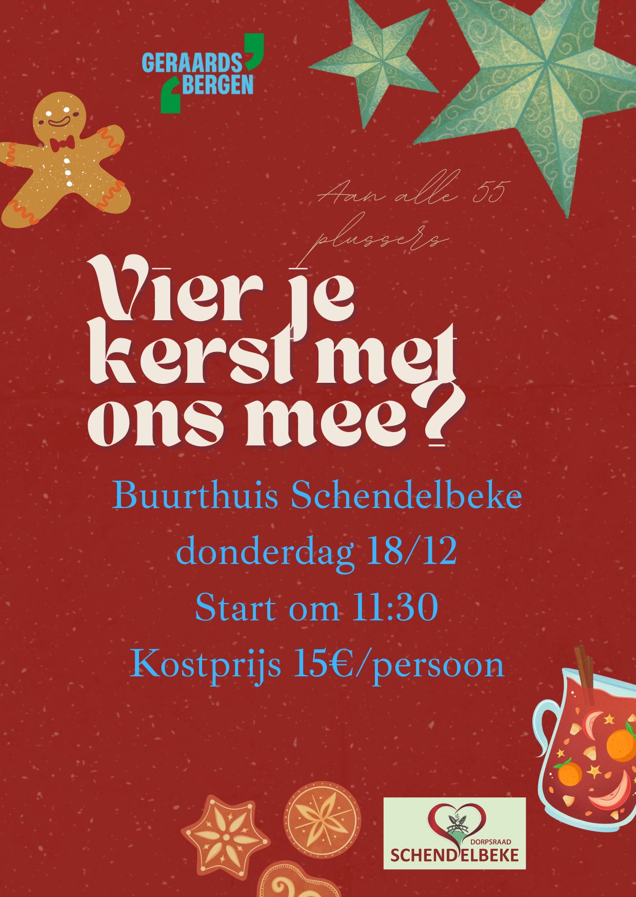 Voor de 2de keer op rij organiseert de stad, in samenwerking met de dorpsraad een kerstfeest voor 55 plussers in het Buurthuis van Schendelbeke.